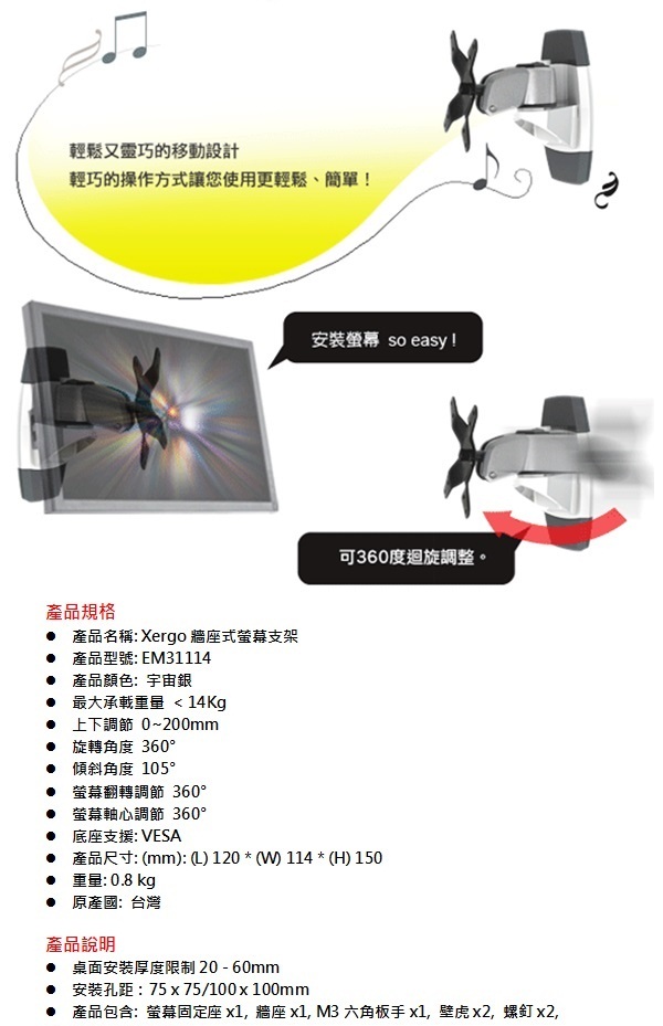 Xergo 牆座式螢幕支架 EM31114